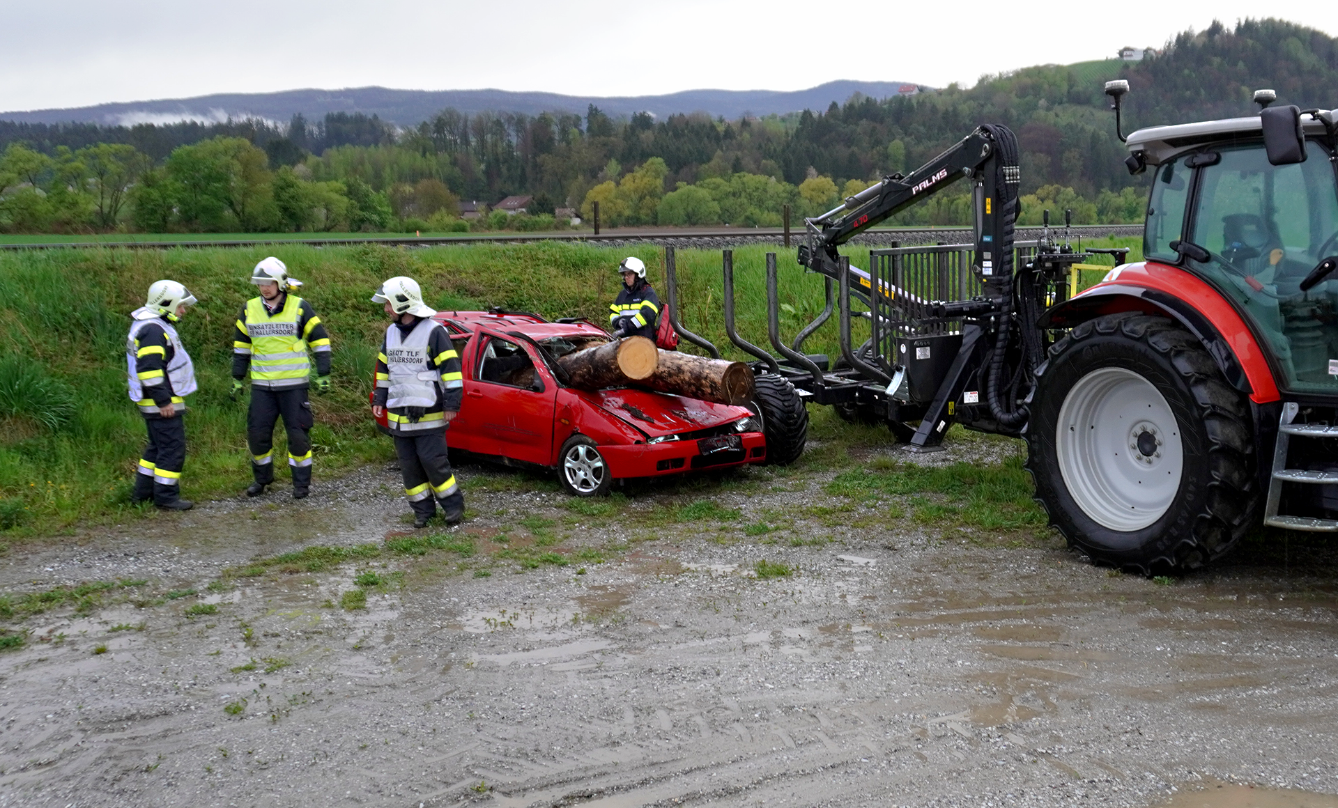 Ein Forstarbeiter wollte ein Auto wegstellen, das beim Verladen von Holz im Weg stand. Jedoch rutschten 2 Baumstämme beim Aufladen vom Kran, durchschlugen die Windschutzscheibe und verletzten den eingeklemmten Fahrer.